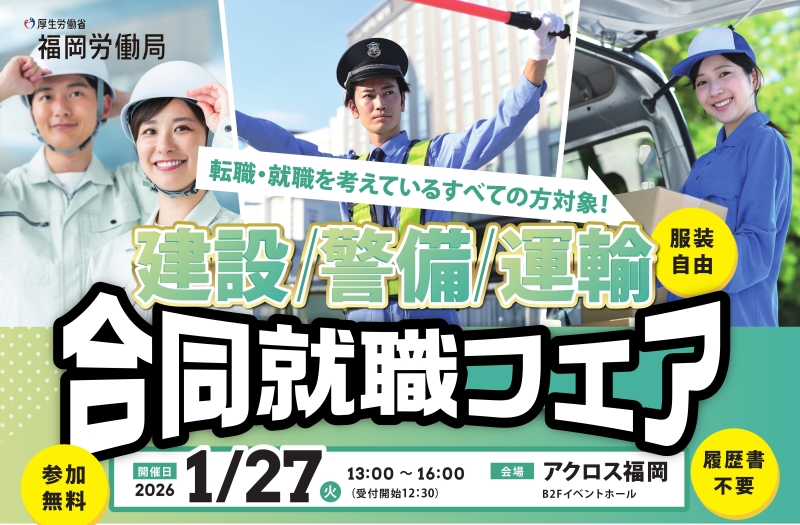 福岡労働局が主催し、福岡県内の企業24社が参加する「建設・警備・運輸業界 合同就職フェア」に出展いたします。